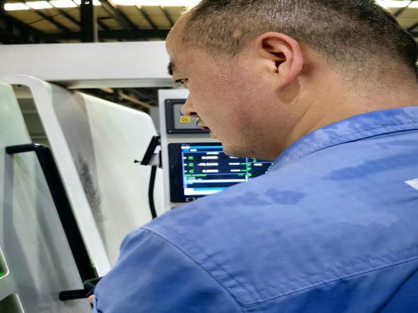 走出不過(guò)二十步,劉師傅正踮腳安裝新工件的身影撞入視線。他藍(lán)色工裝后背洇出大片汗?jié)n,汗水正順著脖頸往下淌。“劉師傅,您這是剛游完泳回來(lái)?”曹景輝笑著遞上冰糕?!摆s工呢!”劉師傅抹了把臉,“前道工序多搶點(diǎn)時(shí)間,后面兄弟們就能松快些?!痹捯粑绰?,他又埋頭調(diào)試起卡盤(pán)。