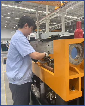 “足蒸暑土氣,背灼炎天光”,走進(jìn)車間,師傅們臉頰上混雜著汗水和黑色的印痕,淺藍(lán)的衣服早已變成深藍(lán)。即便如此,設(shè)備開發(fā)部師傅們也未曾有絲毫的懈怠,嚴(yán)肅的神情和精湛的技藝彰顯著工科人的細(xì)致和專業(yè):整齊擺放的物料嚴(yán)陣以待,調(diào)試好的零件精益求精。機(jī)器的轟鳴和師傅們的吶喊交相呼應(yīng),形成了盛夏中別具一格的交響樂。