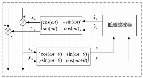 2015年,文獻(xiàn)[18]將電動(dòng)機(jī)傳動(dòng)控制中同步旋轉(zhuǎn)坐標(biāo)系(Synchronous Rotating Frame,SRF)變換的方法應(yīng)用于磁軸承系統(tǒng),其控制原理如圖7所示,相當(dāng)于一種新型的陷波濾波器,通過與控制器串聯(lián)工作在轉(zhuǎn)子低速旋轉(zhuǎn)時(shí)有良好的同步抑振性能。