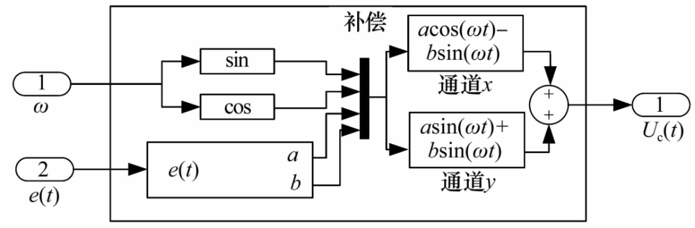 文獻(xiàn)[37]提出了一種尋找不平衡質(zhì)量位置的算法,通過如圖13所示的補(bǔ)償模塊將轉(zhuǎn)子轉(zhuǎn)速作為輸入,根據(jù)實(shí)時(shí)提取的轉(zhuǎn)子不平衡質(zhì)量的大小和位置產(chǎn)生相應(yīng)的控制信號(hào),從而抑制不平衡振動(dòng)。由于該不平衡質(zhì)量與轉(zhuǎn)子轉(zhuǎn)速無關(guān),該算法也適用于變速轉(zhuǎn)子。